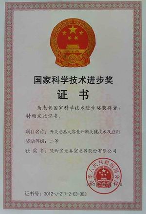 2013年1月18日,在國家科學(xué)技術(shù)大會上,由西安交通大學(xué)、陜西寶光真空電器股份有限公司、常熟開關(guān)制造有限公司、河南平高電器股份有限公司共同完成的《開關(guān)電器大容量開斷關(guān)鍵技術(shù)及應(yīng)用》項目獲得2012年度國家科學(xué)技術(shù)進步獎二等獎,西安交通大學(xué)賈申利教授代表項目組到北京參加會議,并領(lǐng)取了國務(wù)院頒發(fā)的獲獎證書。