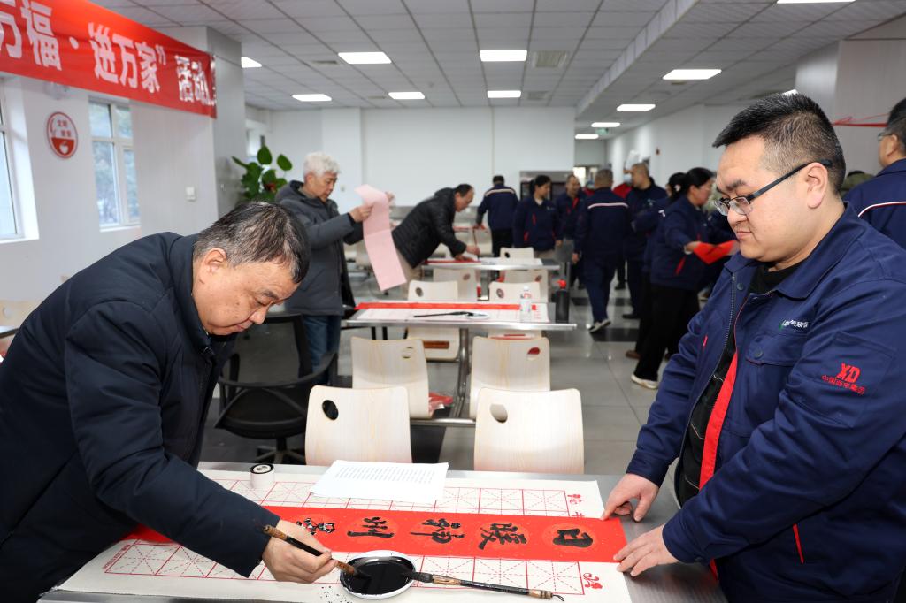 在送春聯(lián)現(xiàn)場,書法家們揮毫潑墨、筆走龍蛇,聞?dòng)嵍鴣淼穆毠ぜ娂妵跁琅云诖善贰R煌R活D、一起一落,一句句散發(fā)著清新墨香的吉祥語句躍然紙上,“一元二氣三陽泰,四時(shí)五福六合春”“春滿乾坤千里秀,時(shí)逢盛世萬家興”,一副副滿載美好祝福的春聯(lián)和“福”字躍然紙上,既有辭舊迎新的熱切祈盼,也有對幸福生活的美好祝福。職工們拿到寫滿祝福和美好祝愿的春聯(lián),喜悅之情溢于言表。活動(dòng)期間共送出春聯(lián)近400余幅,福字300余幅。