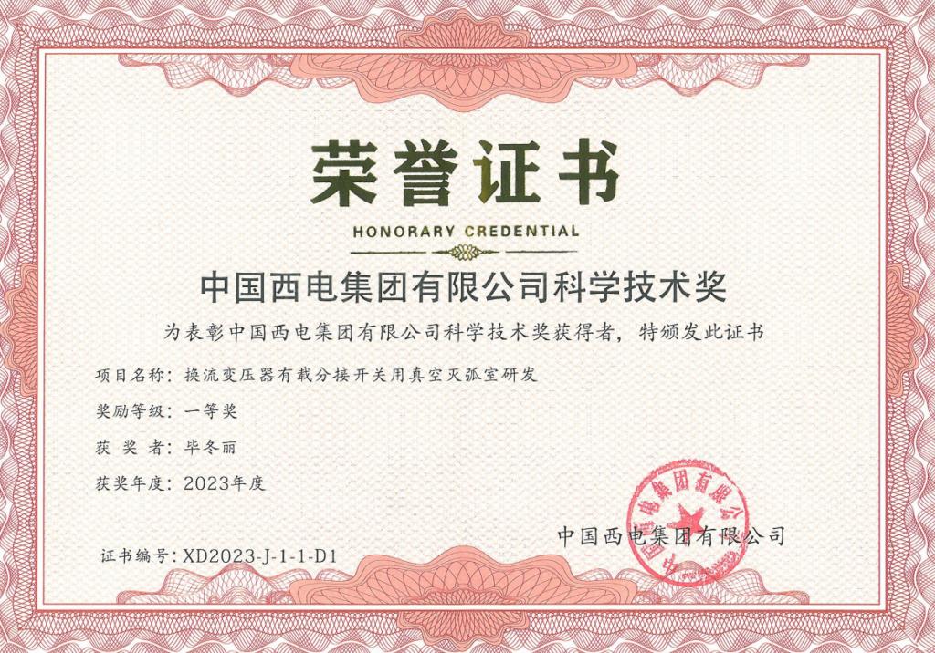 近日,寶光股份《換流變壓器有載分接開關用真空滅弧室研發》與《風電用40.5 kV/1250 A-31.5 kA真空滅弧室及固封極柱研發》兩個技術創新項目,分別榮獲2023年度中國西電集團科學技術獎“一等獎”與“二等獎”!